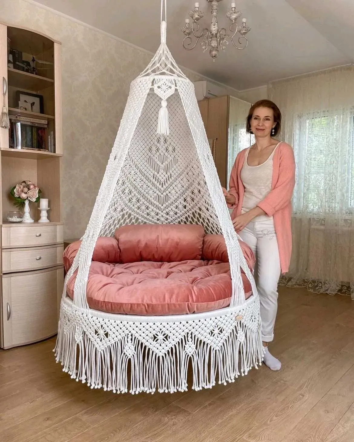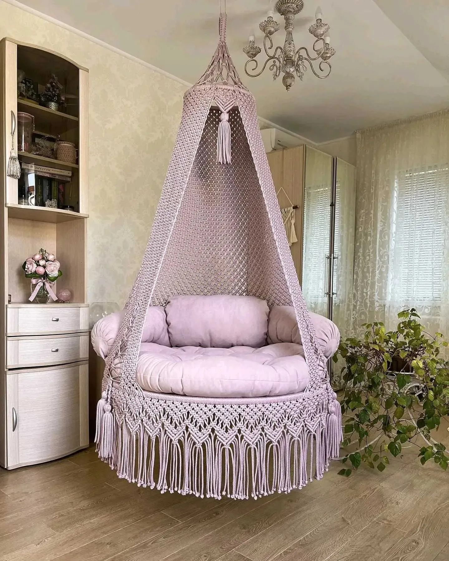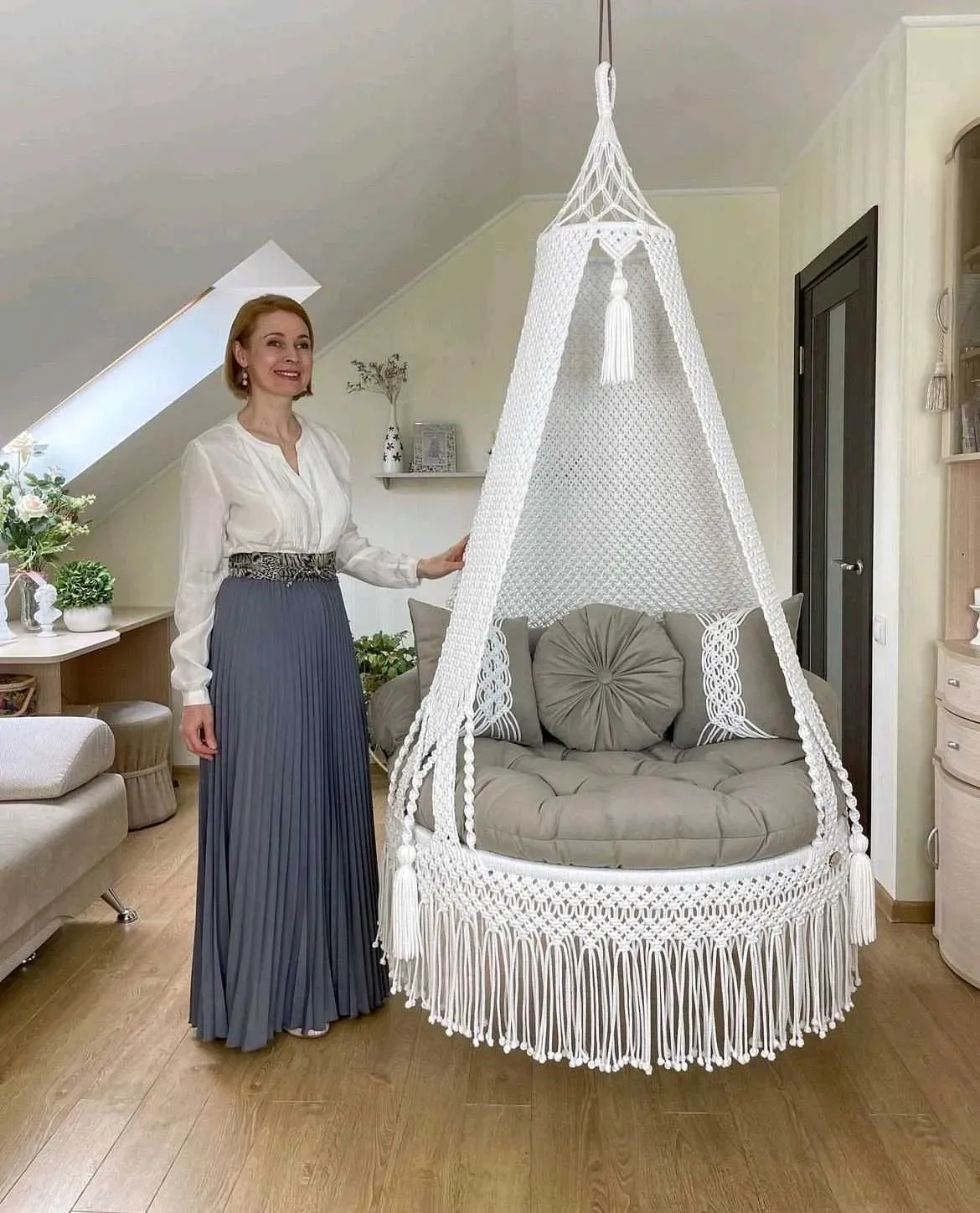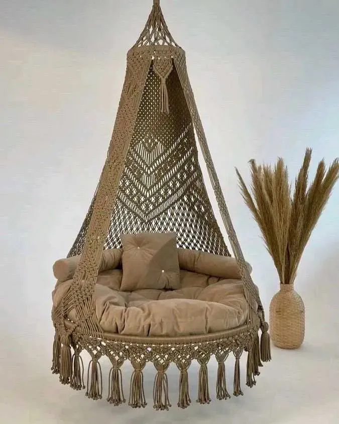 Esta hermosa hamaca columpio de macramé es el complemento perfecto para tu hogar. Hecha a mano con materiales de alta calidad, brinda comodidad y estilo a cualquier espacio. Disfruta de momentos de relajación y tranquilidad con esta pieza única y elegante.