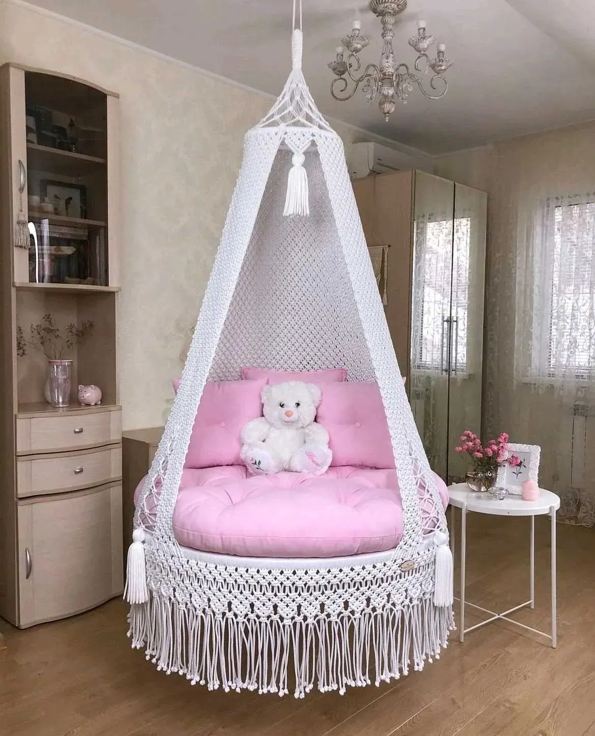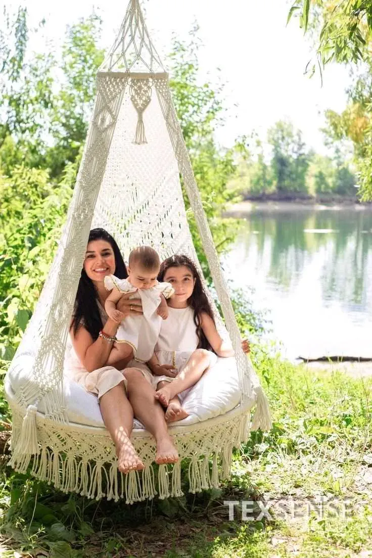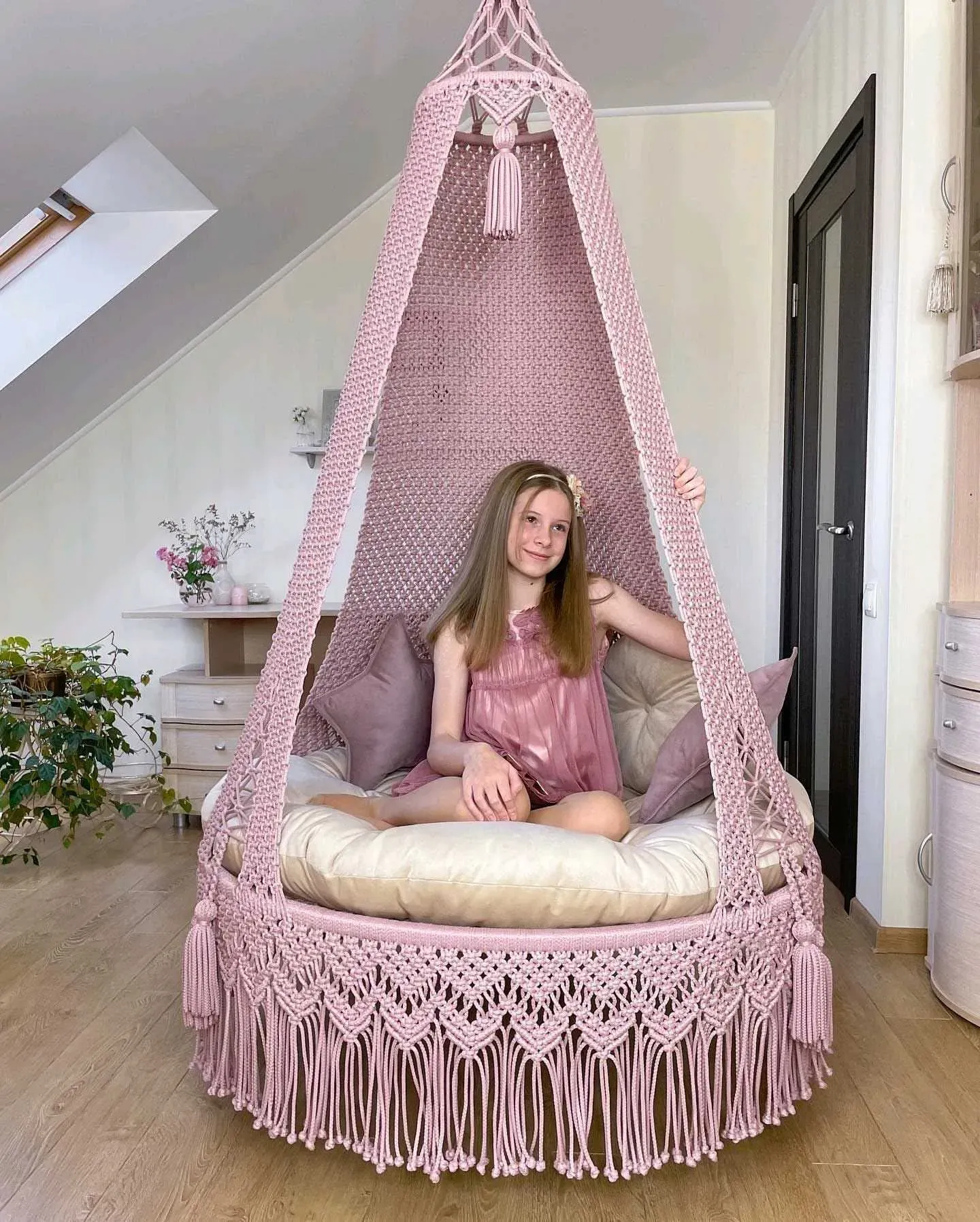 Esta hermosa hamaca columpio de macramé es el complemento perfecto para tu hogar. Hecha a mano con materiales de alta calidad, brinda comodidad y estilo a cualquier espacio. Disfruta de momentos de relajación y tranquilidad con esta pieza única y elegante.